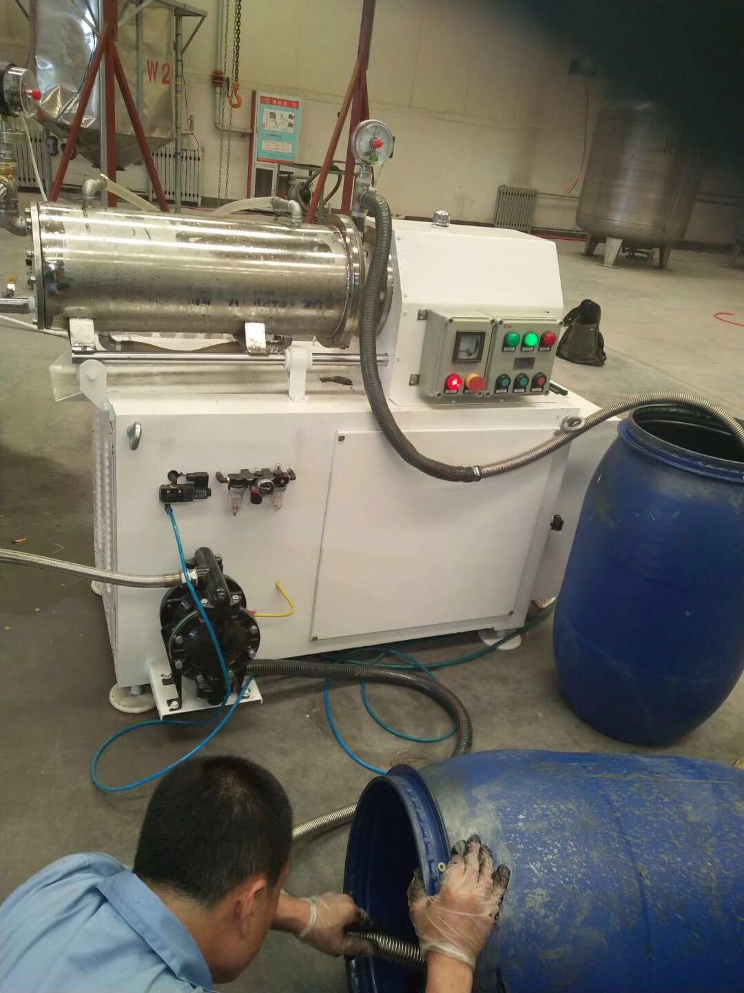 臥式砂磨機(jī)是一種廣泛用于涂料、染料、油漆、油墨、醫(yī)藥、磁臥式砂磨機(jī)粉、鐵氧體、感光膠片、農(nóng)藥、造紙以及化妝品等非金屬礦行業(yè)的濕法超微研磨分散機(jī)械。臥式砂磨機(jī)按結(jié)構(gòu)不同可分為普通臥式砂磨機(jī),輪銷(xiāo)臥式砂磨機(jī),齒盤(pán)臥式砂磨機(jī)及渦輪式臥式砂磨機(jī)。 臥式砂磨機(jī)工作連續(xù)性強(qiáng),少污染,自控可靠,且成本低,結(jié)構(gòu)緊湊 1、 普通臥式砂磨機(jī)按工作筒體的有效容積分為:WS-10、WS-20、WS-30、WS-50、WS-60、WS-80、WS-100七種機(jī)型。 2、 按與物料接觸的材質(zhì)分為碳鋼和不銹鋼。 3、 按具體使用條件和要求,分防爆和普通電機(jī)共二十種機(jī)型。 是利用料泵將經(jīng)過(guò)攪拌機(jī)預(yù)分散潤(rùn)濕處理后的固-液相混合物料輸入筒體內(nèi),物料和筒體內(nèi)的研磨介質(zhì)一起被高速旋轉(zhuǎn)的分散器攪動(dòng),從而使物料中的固體 微粒和研磨介質(zhì)相互間產(chǎn)生更加強(qiáng)烈的碰撞、摩擦、剪切作用,達(dá)到加快磨細(xì)微粒和分散聚集體的目的。研磨分散后的物料經(jīng)過(guò)動(dòng)態(tài)分離器分離研磨介質(zhì),從出料管流出。臥式砂磨機(jī)特別適合分散研磨粘度高而粒度要求細(xì)的產(chǎn)品。 |